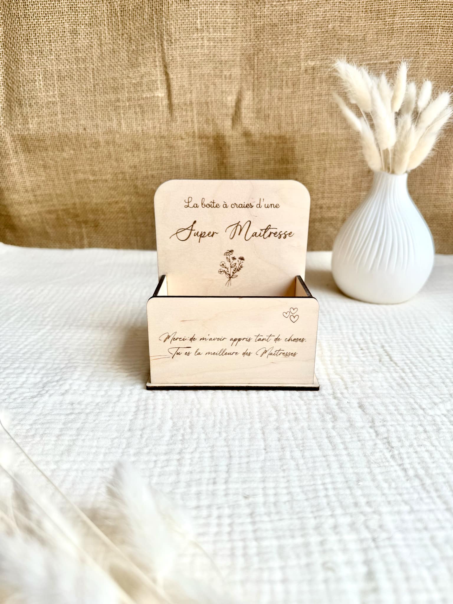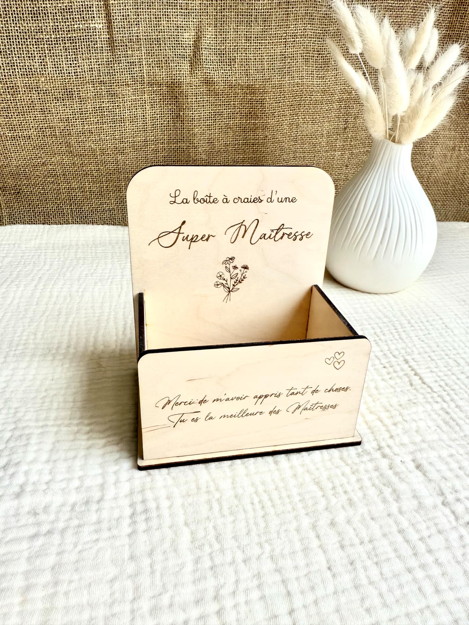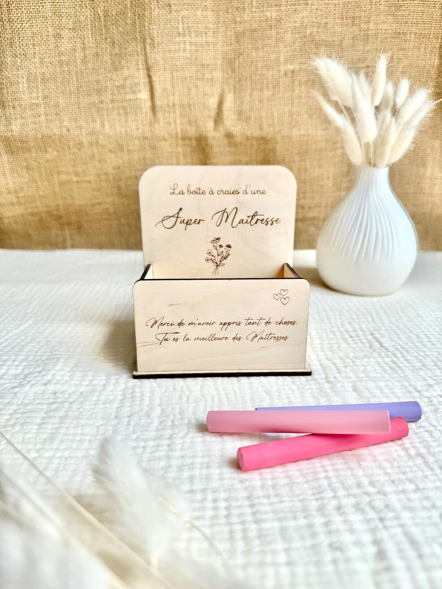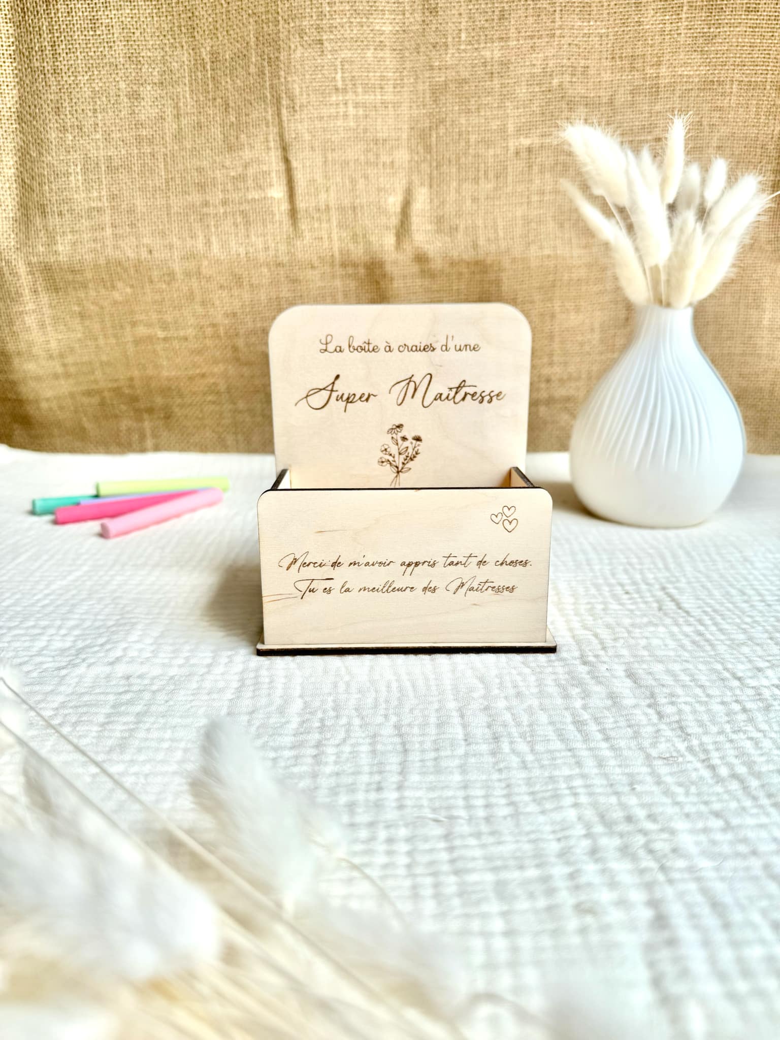 Si vous êtes à la recherche d'un cadeau original à offrir à la maîtresse pour la fin d'année scolaire, cette boîte à craie sera le cadeau parfait ! Elle est entièrement faites de bois et assemblé à la main. La maîtresse pourra y stocker ses nombreuses craies.