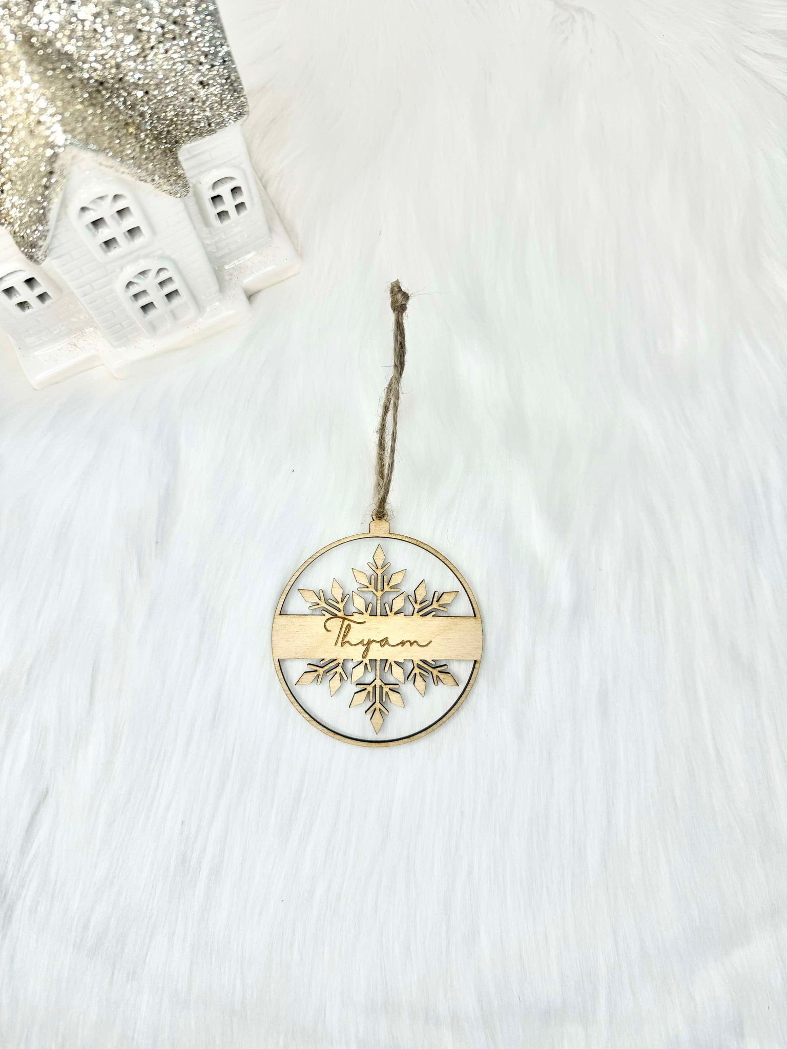 Magnifique boule de Noël en bois à personnalisé avec le prénom de votre choix. L'écriture et les motifs sont gravés sur le bois.