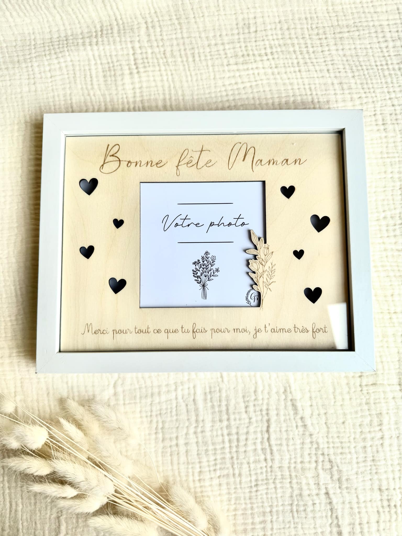 Joli cadre personnalisé à offrir à une formidable maman. La particularité de ce cadre est qu'il est lumineux. Avec ses petits cœurs découpés, il laisse passer la lumière pour un effet chaleureux. Dans le noir, avec la lumière du cadre, la photo est visible.