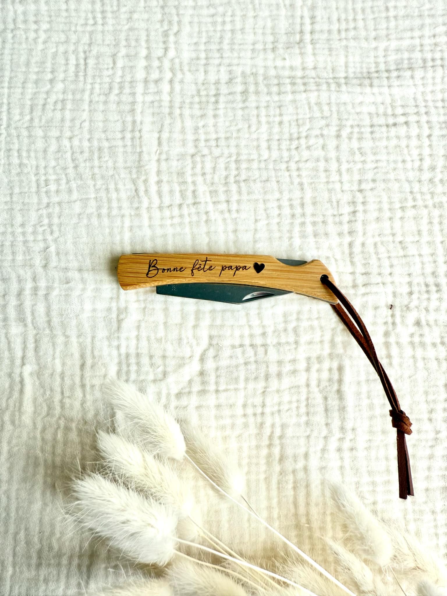 Un superbe couteau de poche à offrir à votre papa ou celui de votre enfant à l'occasion de la fête des papas. La personnalisation est gravé sur le bois. Vous avez la possibilité d'ajouter le prénom de l'enfant au dos du couteau. Vous pouvez également changer le message.