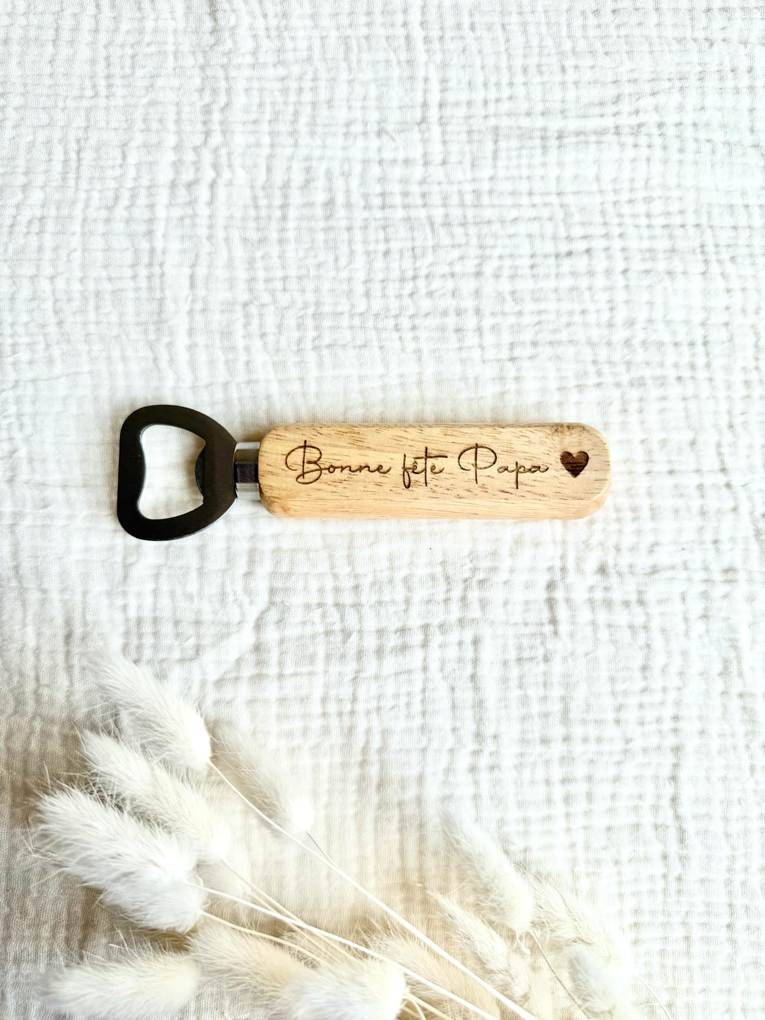 Décapsuleur à offrir à votre papa ou celui de votre enfant. L'inscription est gravé sur le bois.