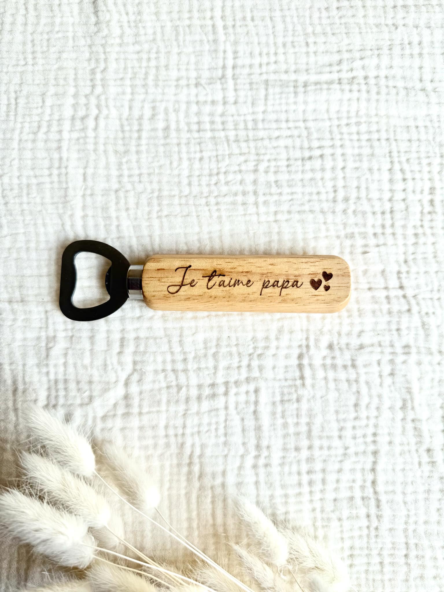 Décapsuleur à offrir à votre papa ou celui de votre enfant. L'inscription est gravé sur le bois.