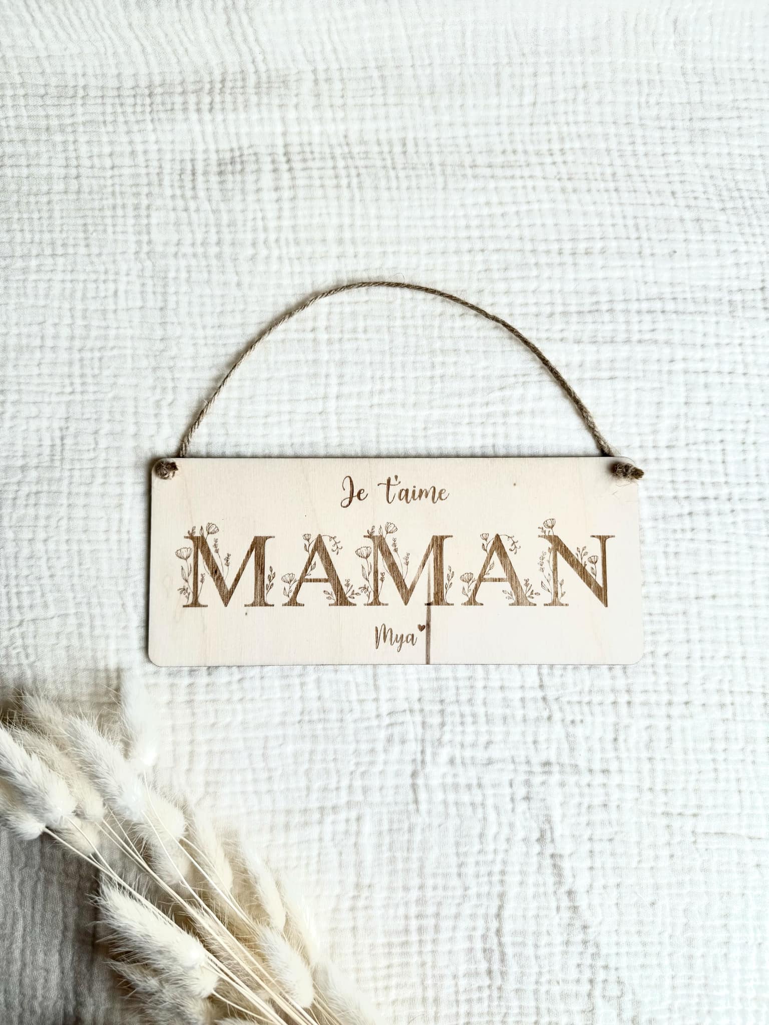 Magnifique petite pancarte à suspendre avec des motifs fleuri au niveau des lettres à offrir à sa maman. Les motifs sont gravés sur le bois. La gravure et la couleur du bois peut varier d'une création à une autre.