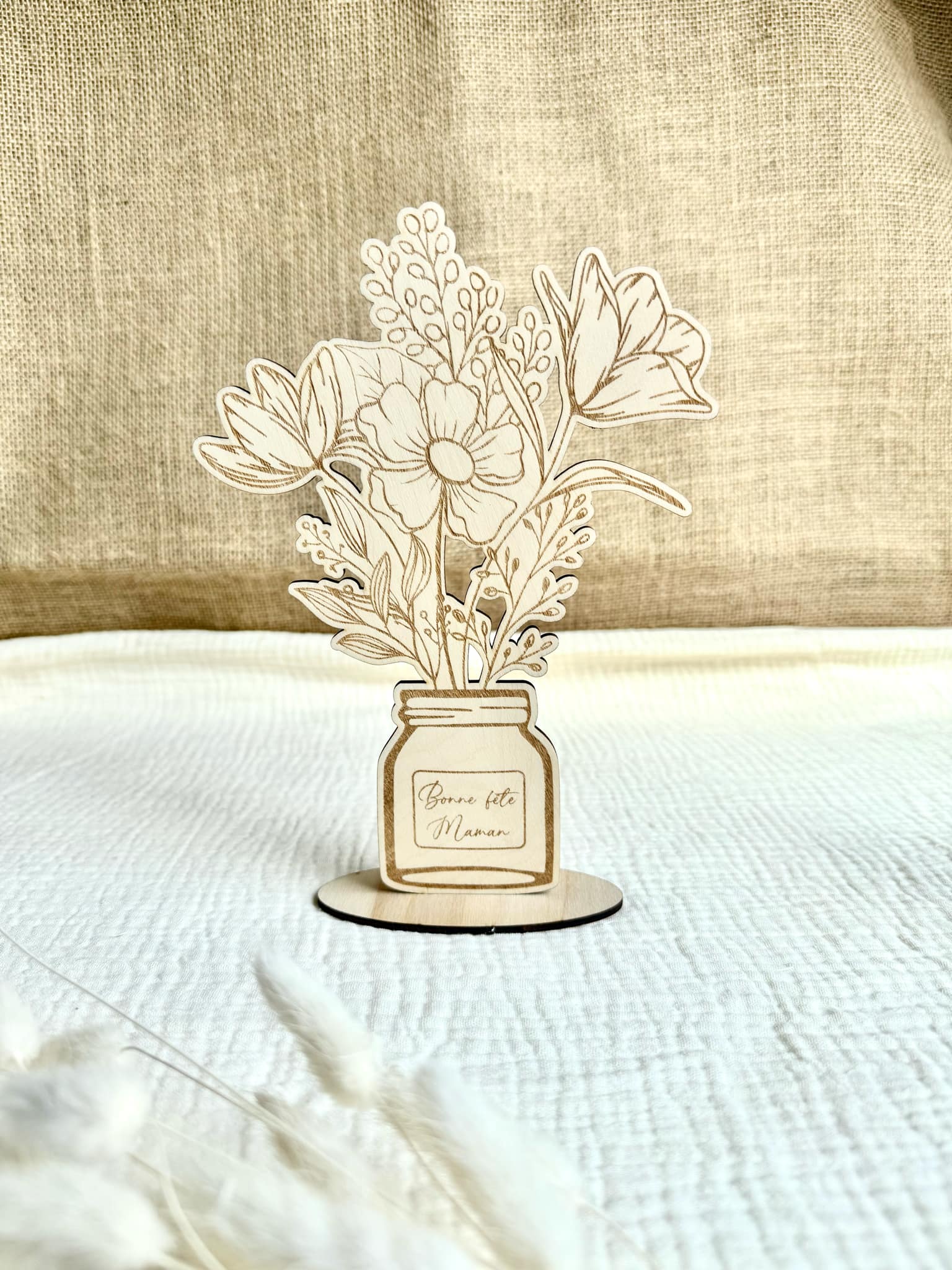 Magnifique petite décoration en bois, représentant un bouquet de fleurs avec un joli mot écrit dessus. Vous pouvez le personnaliser comme vous le souhaitez. Il suffit de l'inscrire dans l'encadré "personnalisation" avant d'ajouter l'article dans votre panier.