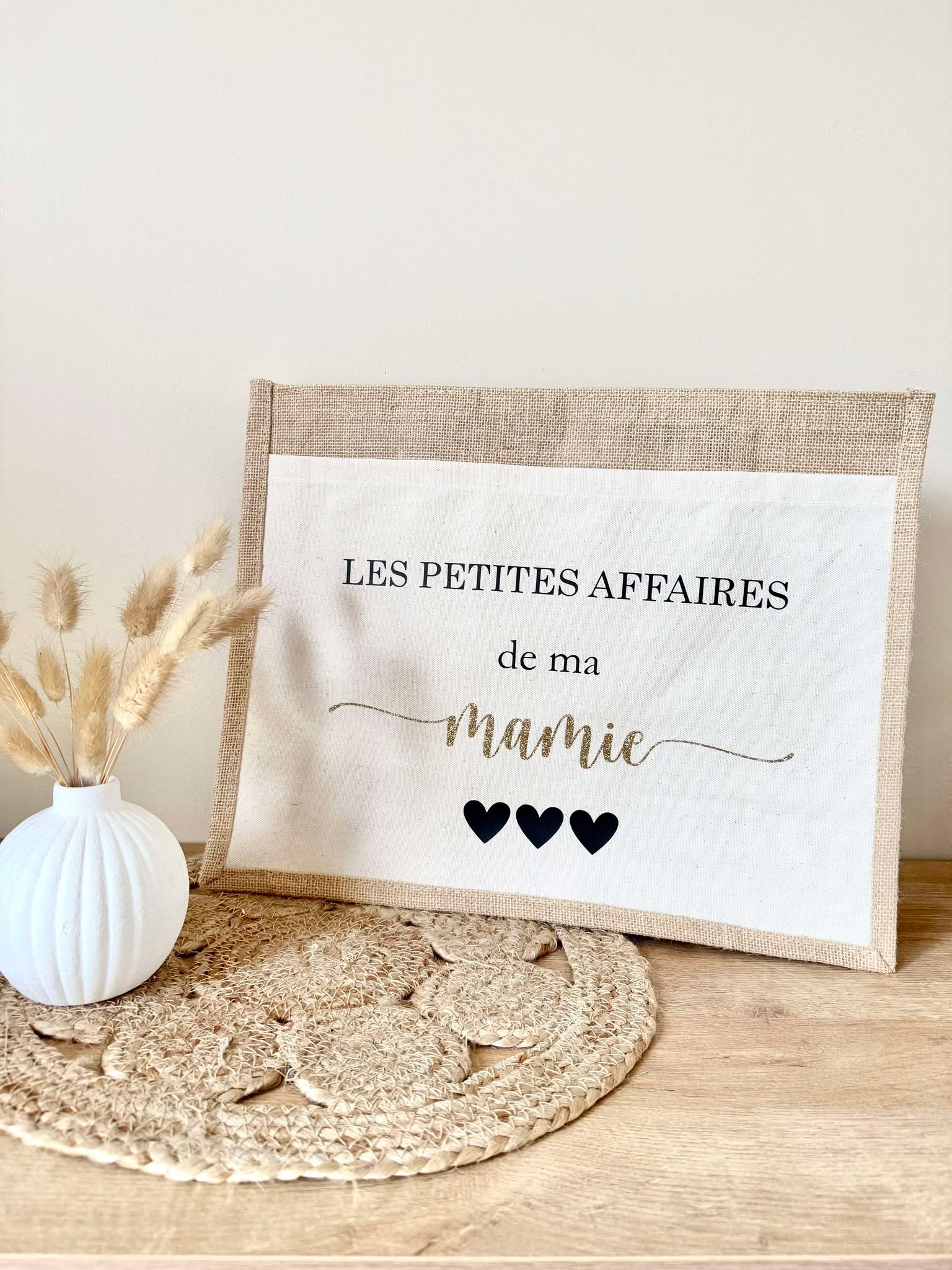 Grand sac en toile de jute à offrir à sa mamie. Vous pouvez le personnalisé avec le prénom de l'enfant.