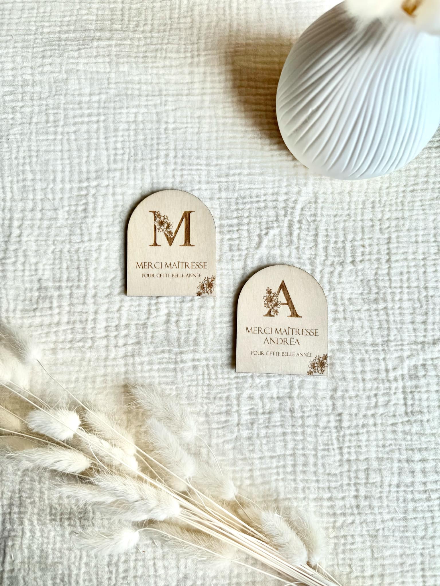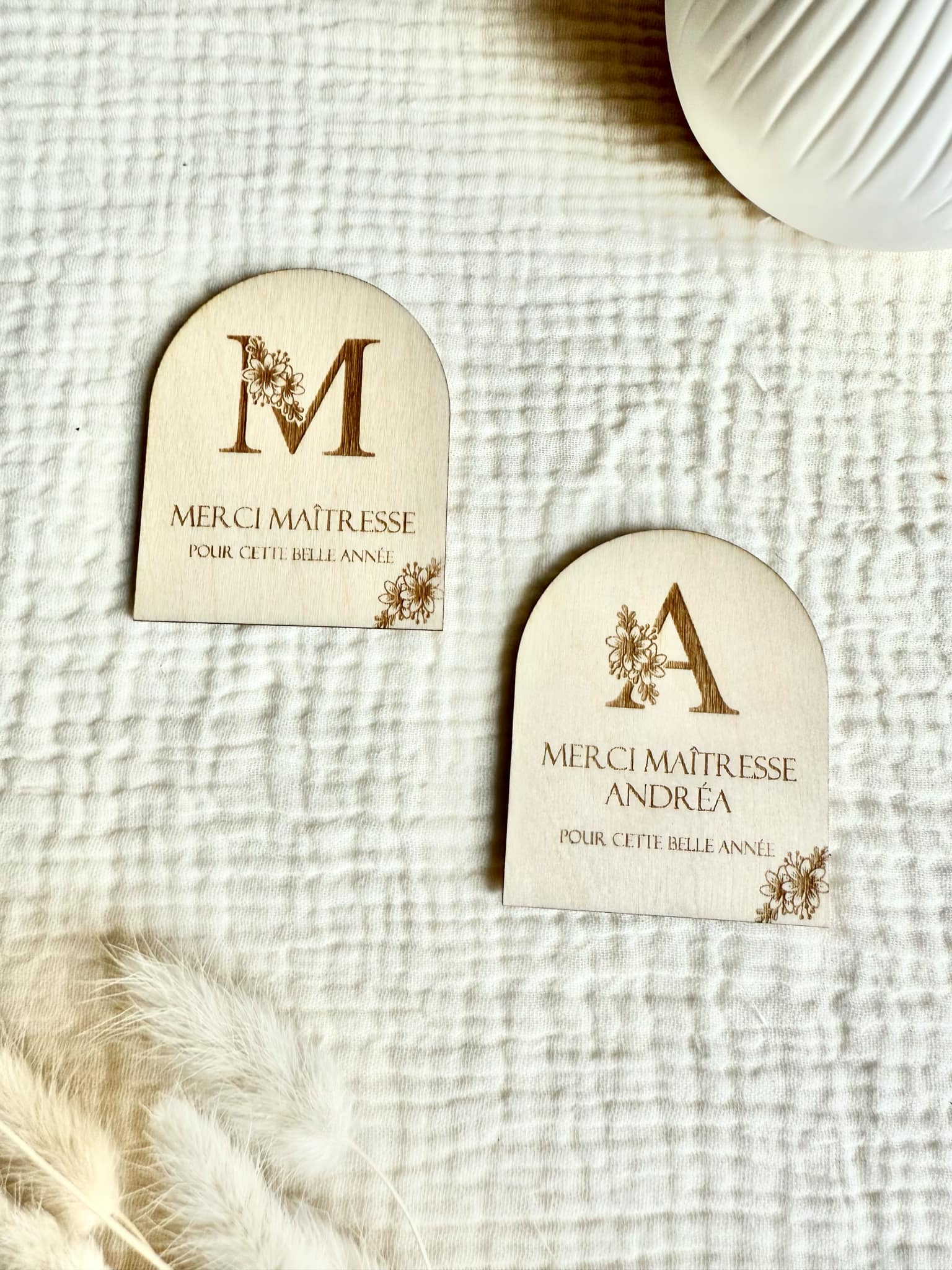 Joli magnet en forme d'arche à offrir à votre maîtresse. Le magnet est en bois, les écritures sont gravés dessus.