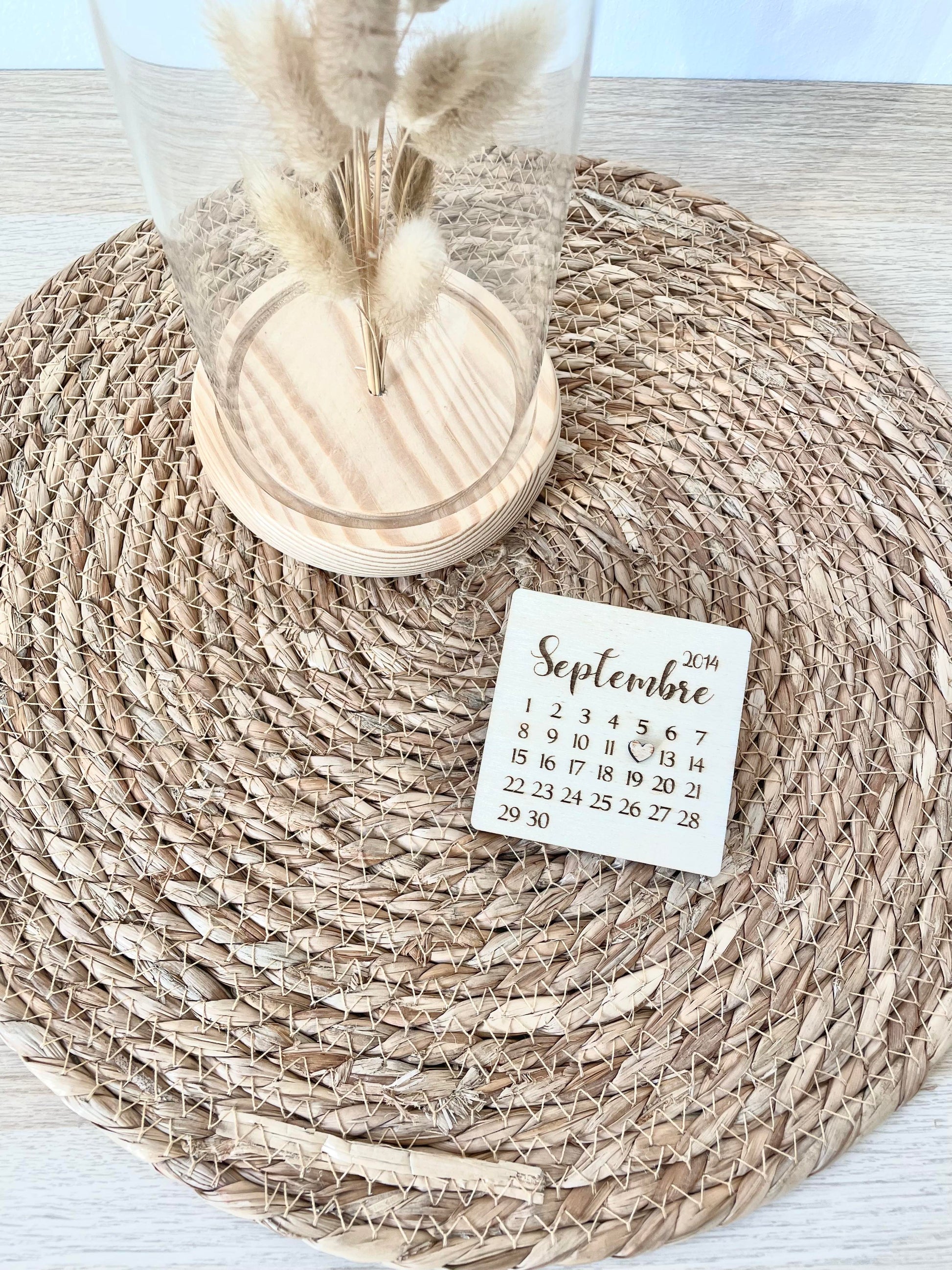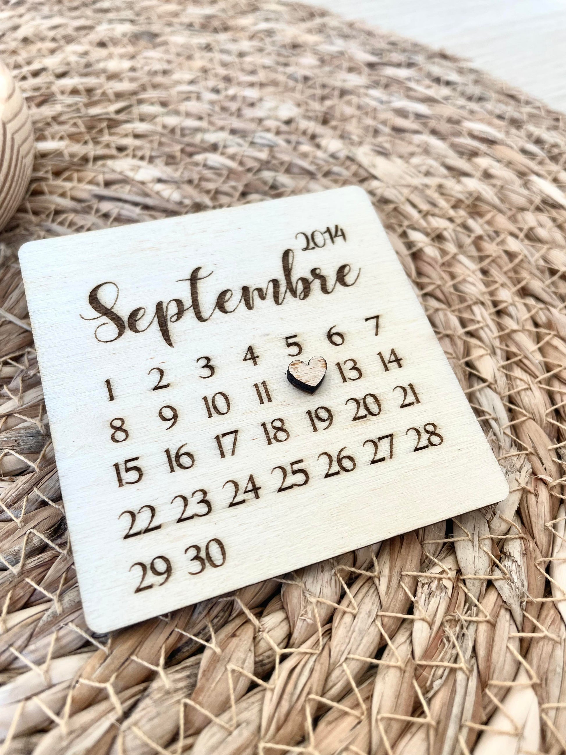 Joli magnet avec la date de votre rencontre avec votre moitié. Le magnet est en bois, les écritures sont gravés dessus, et le petit cœur est en relief.