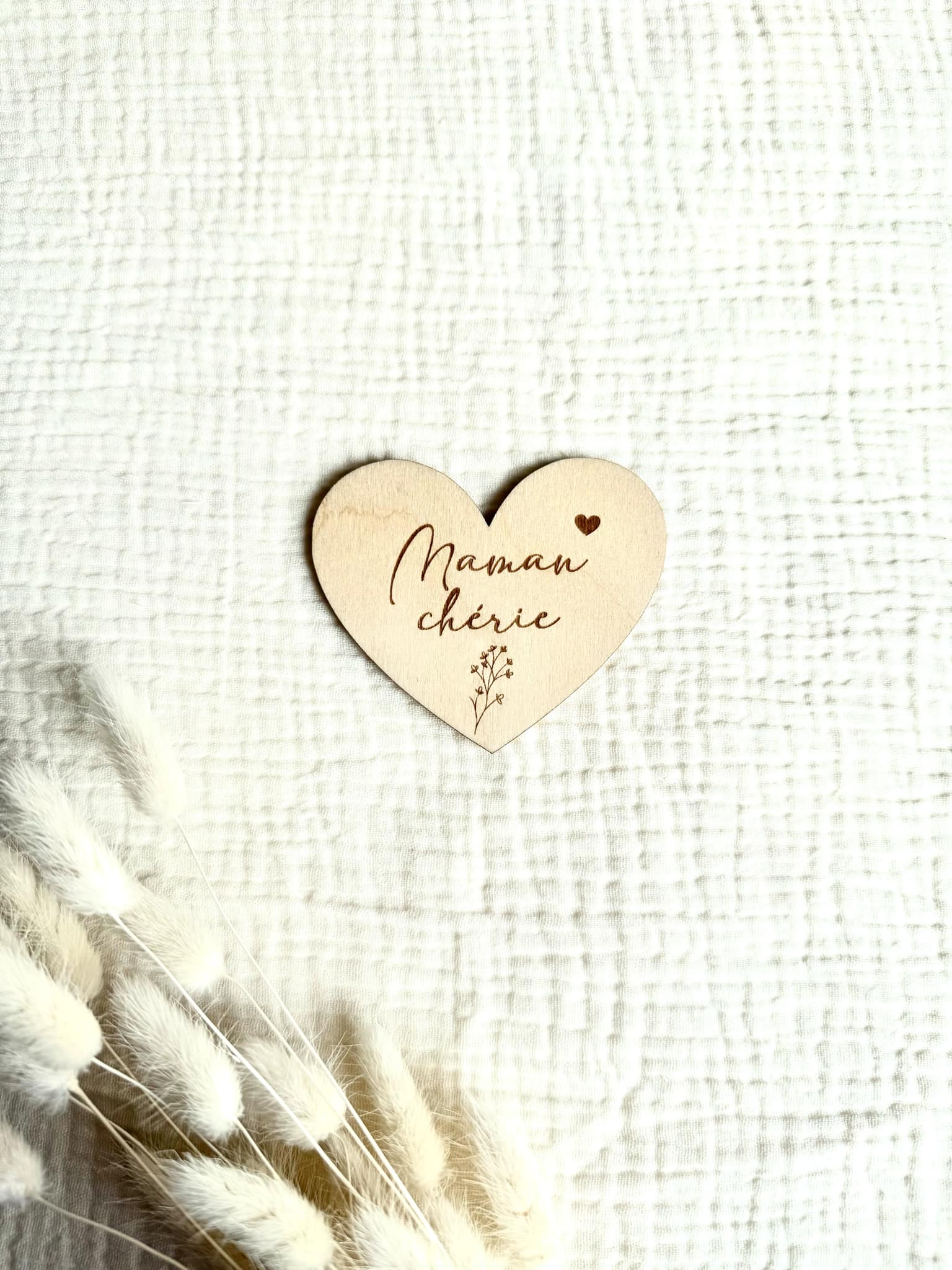 Joli magnet en forme de coeur à offrir à l'occasion de la fête des mamans. Le magnet est en bois, les écritures sont gravés dessus.