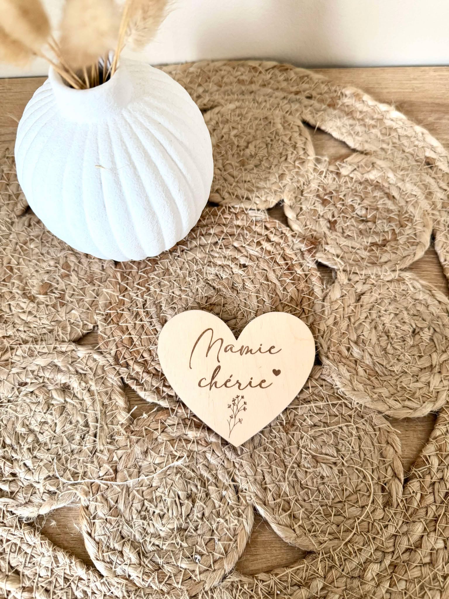 Joli magnet en forme de coeur à offrir à l'occasion de la fête des mamies. Le magnet est en bois, les écritures sont gravés dessus.