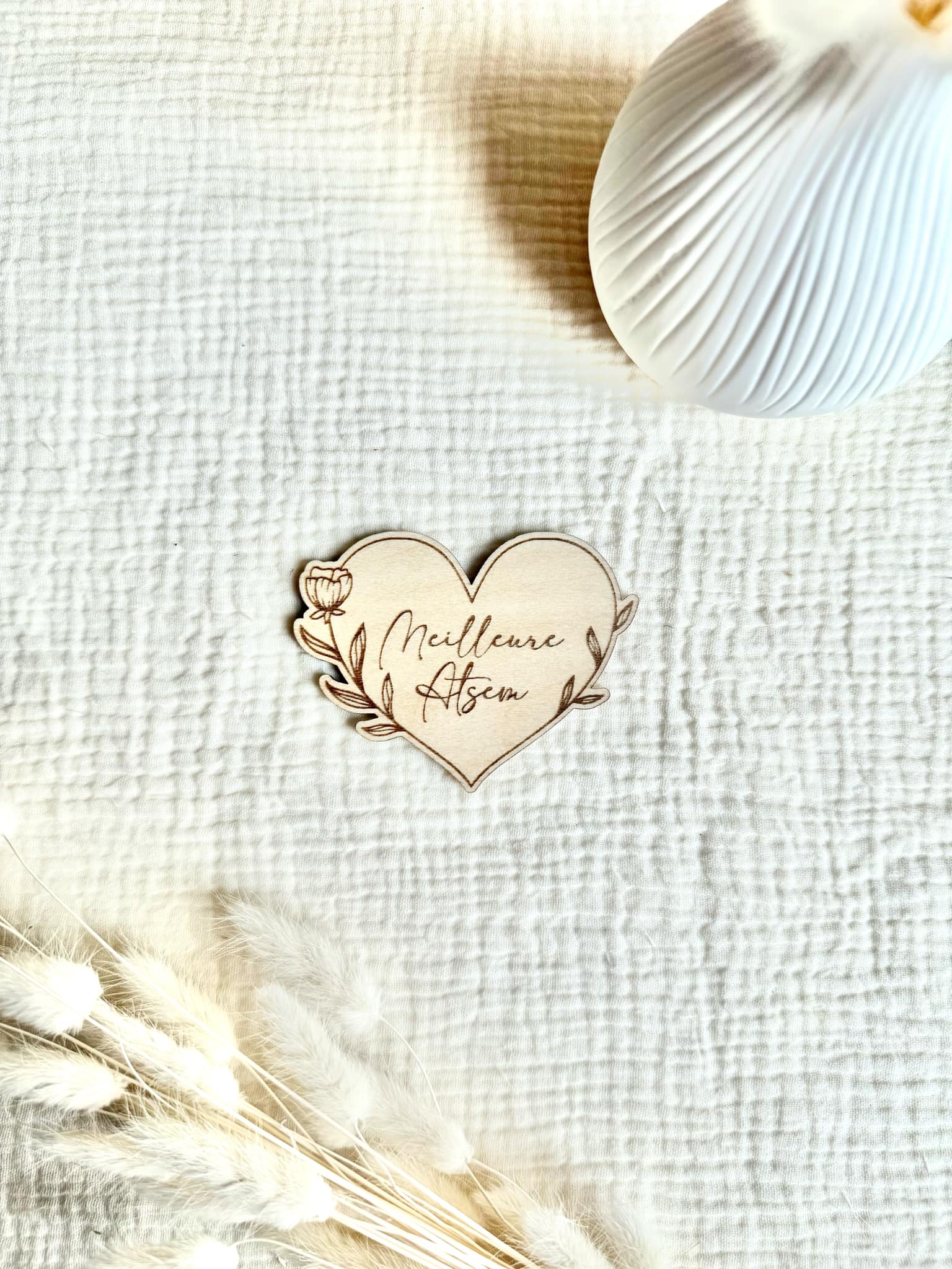 Joli magnet en forme de cœur à offrir à l'ATSEM de votre enfant. Le magnet est en bois, les écritures sont gravés dessus.
