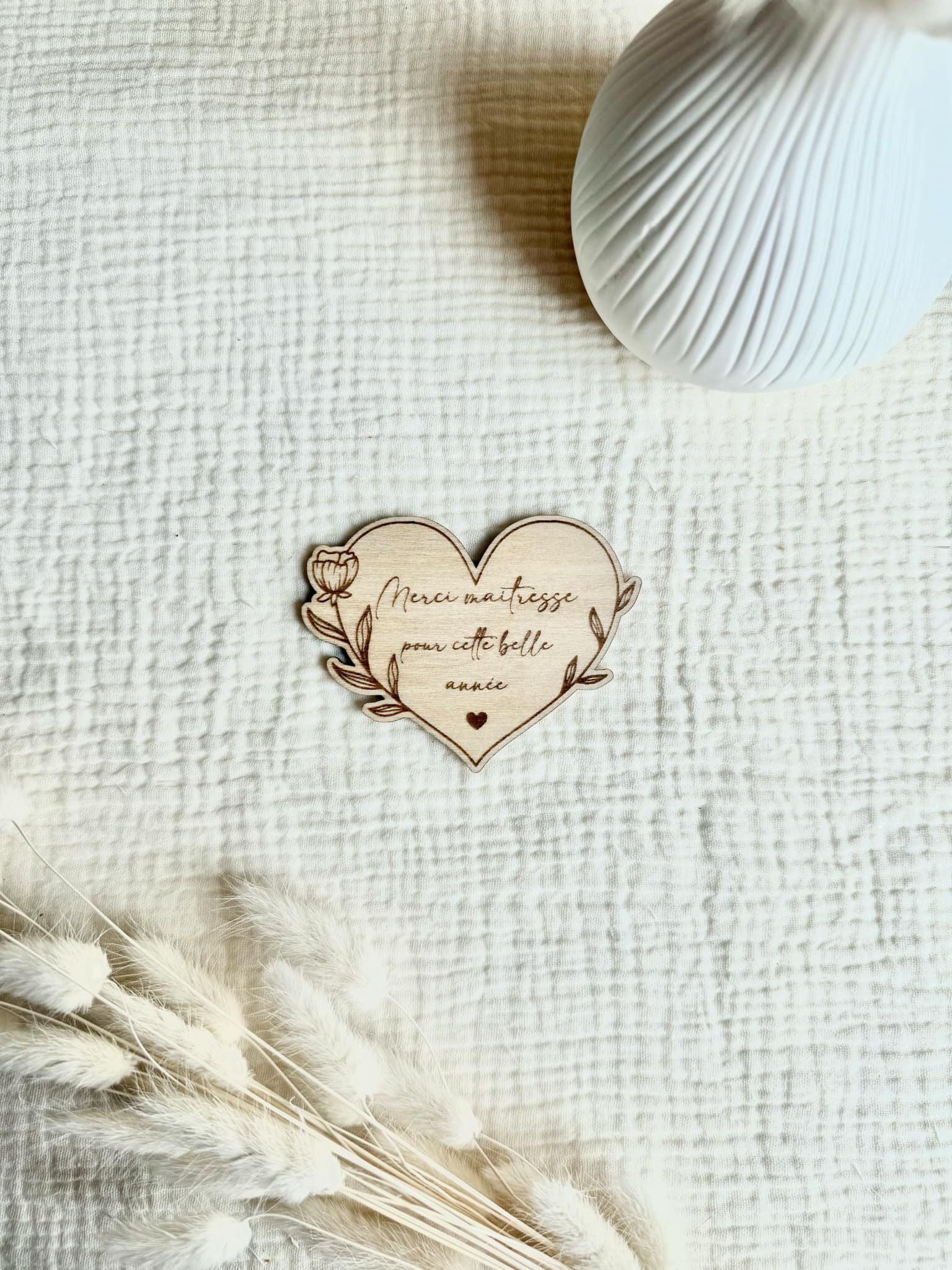 Joli magnet en forme de coeur à offrir à votre maîtresse. Le magnet est en bois, les écritures sont gravés dessus.