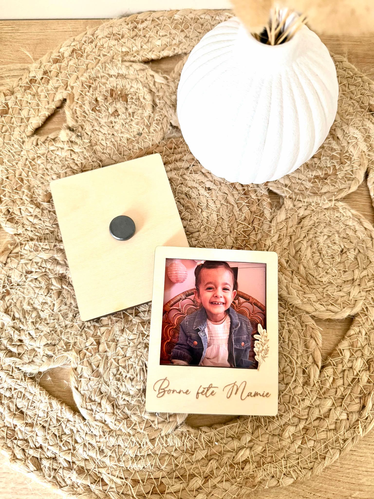 Joli magnet à offrir à l'occasion de la fête des mamies. Le magnet est en bois, les écritures sont gravés dessus. Vous pouvez glisser une photo à l'intérieur du magnet, ce qui le rend encore plus personnalisé.