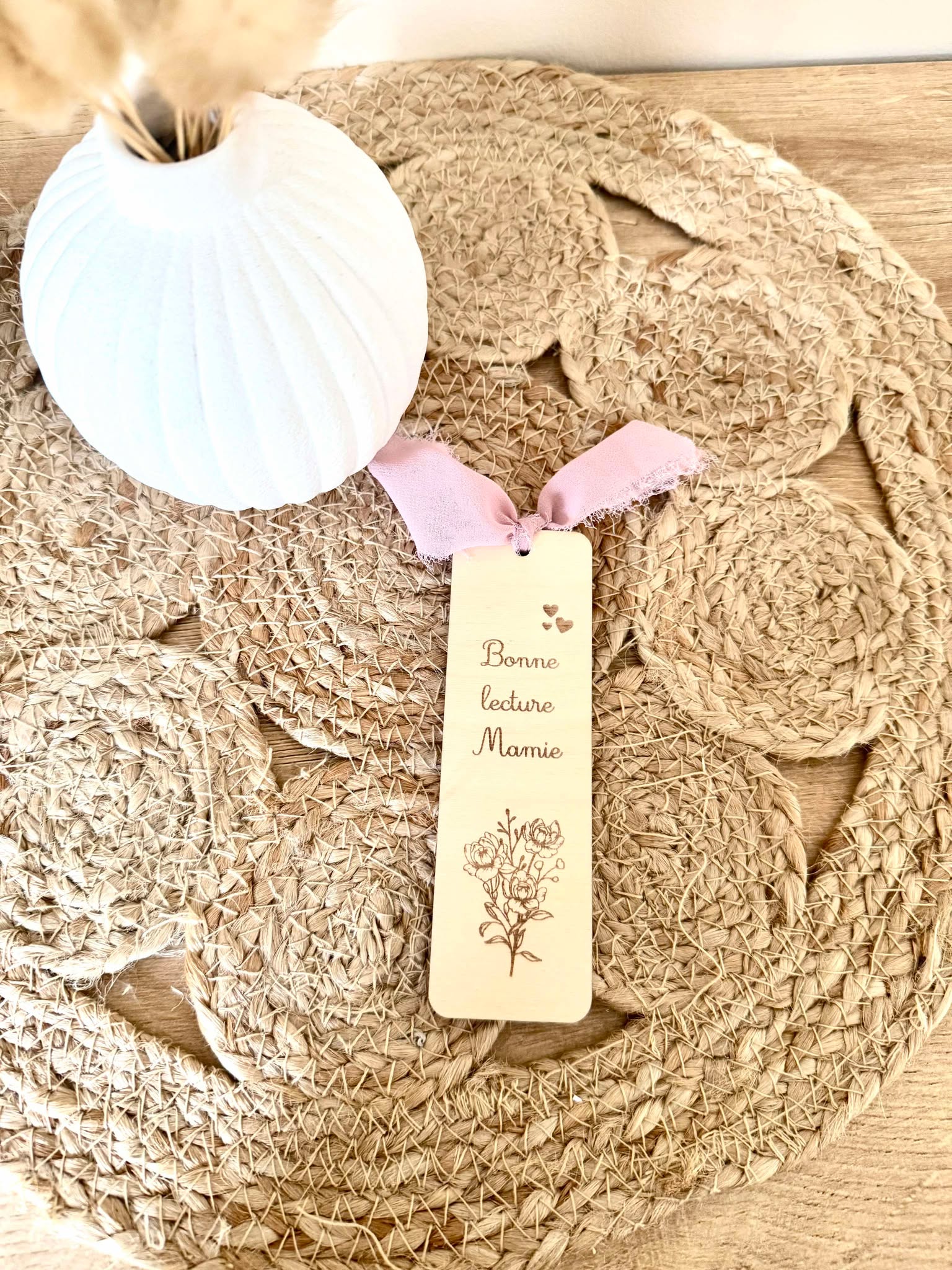 Marque page à offrir à votre mamie ou celle de votre enfant. Le ruban en mousseline de soie peut être en couleur blanc, ivoire ou rose. Merci de préciser la couleur que vous préférez dans l'encadré "personnalisation" sinon celle-ci sera mise aléatoirement. Vous pouvez changer le texte, et ajouter le prénom de l'enfant si vous le souhaitez.