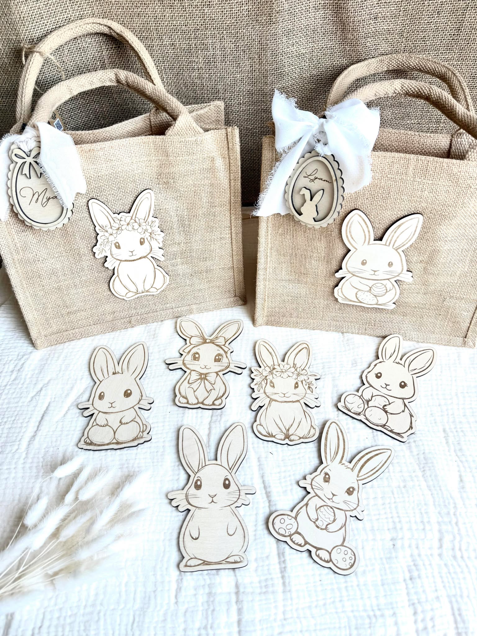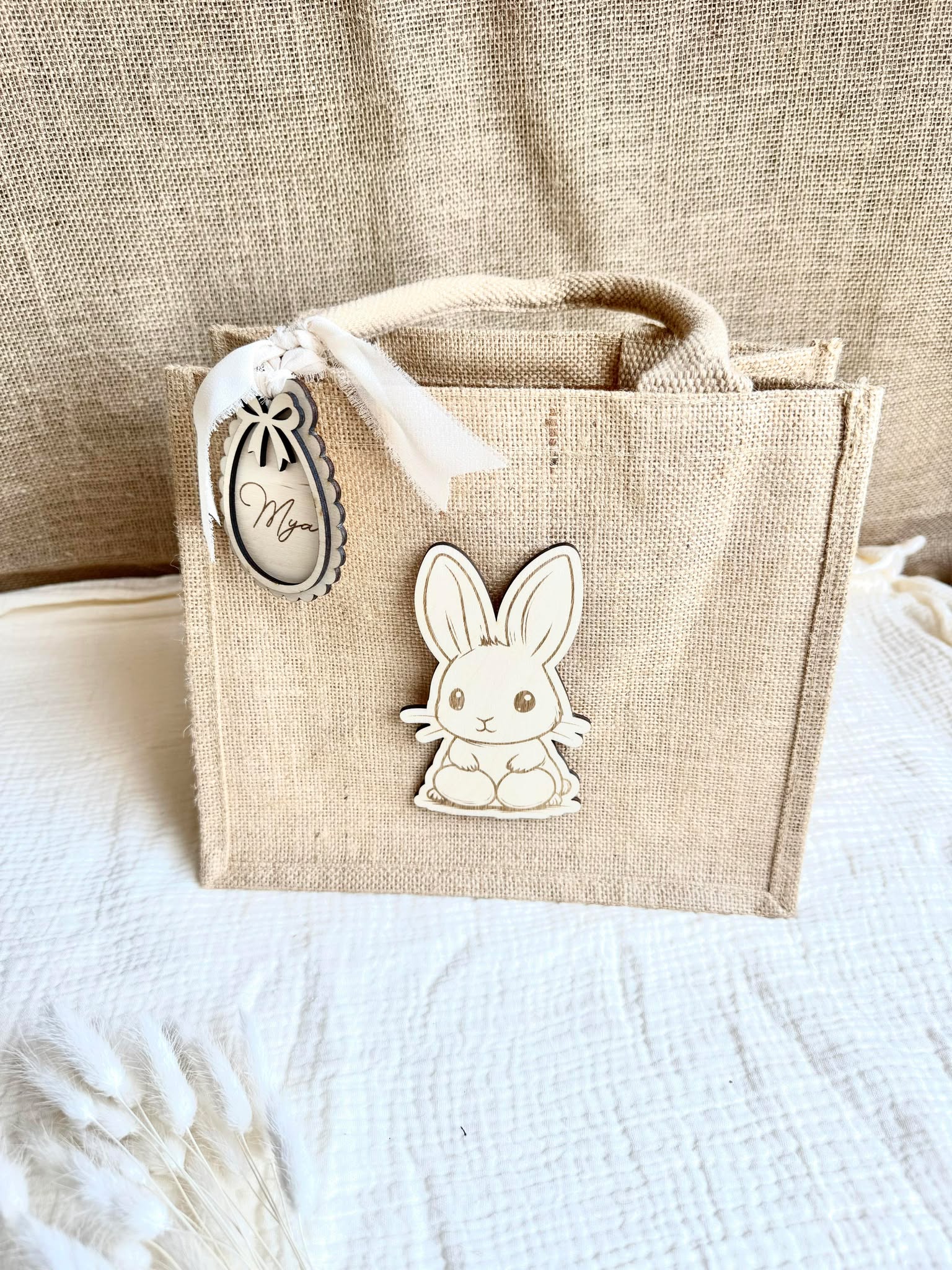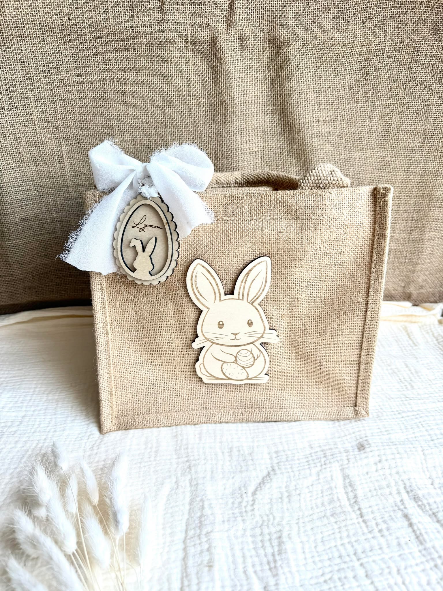 Petit sac en toile de jute décoré et personnalisé d'un petit lapin et d'un œuf en bois. Idéal pour la chasse aux œufs de vos enfants, il lui permettra de mettre leur petites trouvailles de chocolats à l'intérieur.