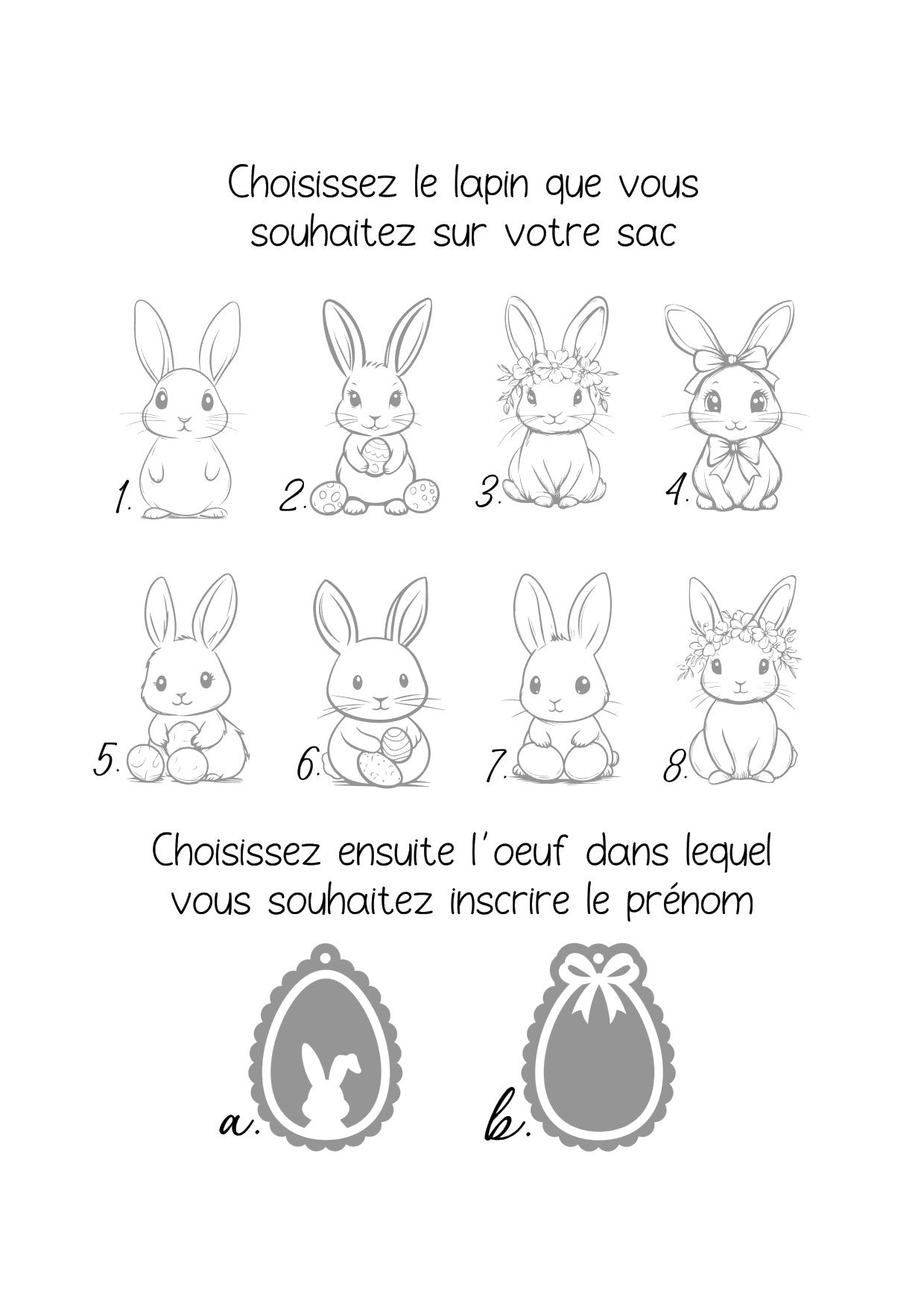 Vous pouvez choisir le petit lapin parmi la sélection, ainsi que la forme de l'œuf parmi les deux choix. Voir la dernière photo de la fiche produit.