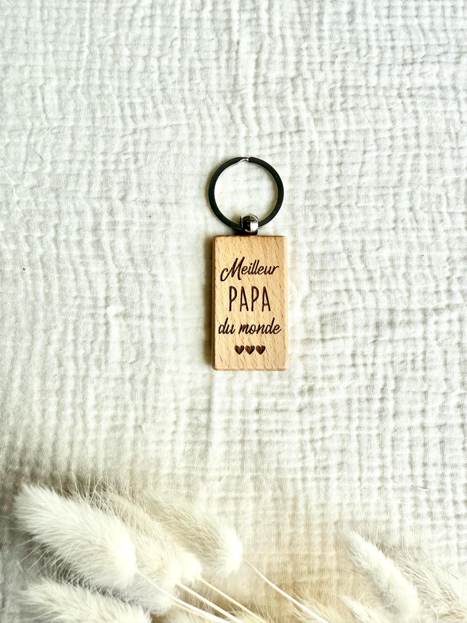 Joli porte clé en bois à offrir à votre papa ou celui de votre enfant. L'inscription sur le porte clé est gravé sur le bois, et gravé des deux côtés du porte clé.