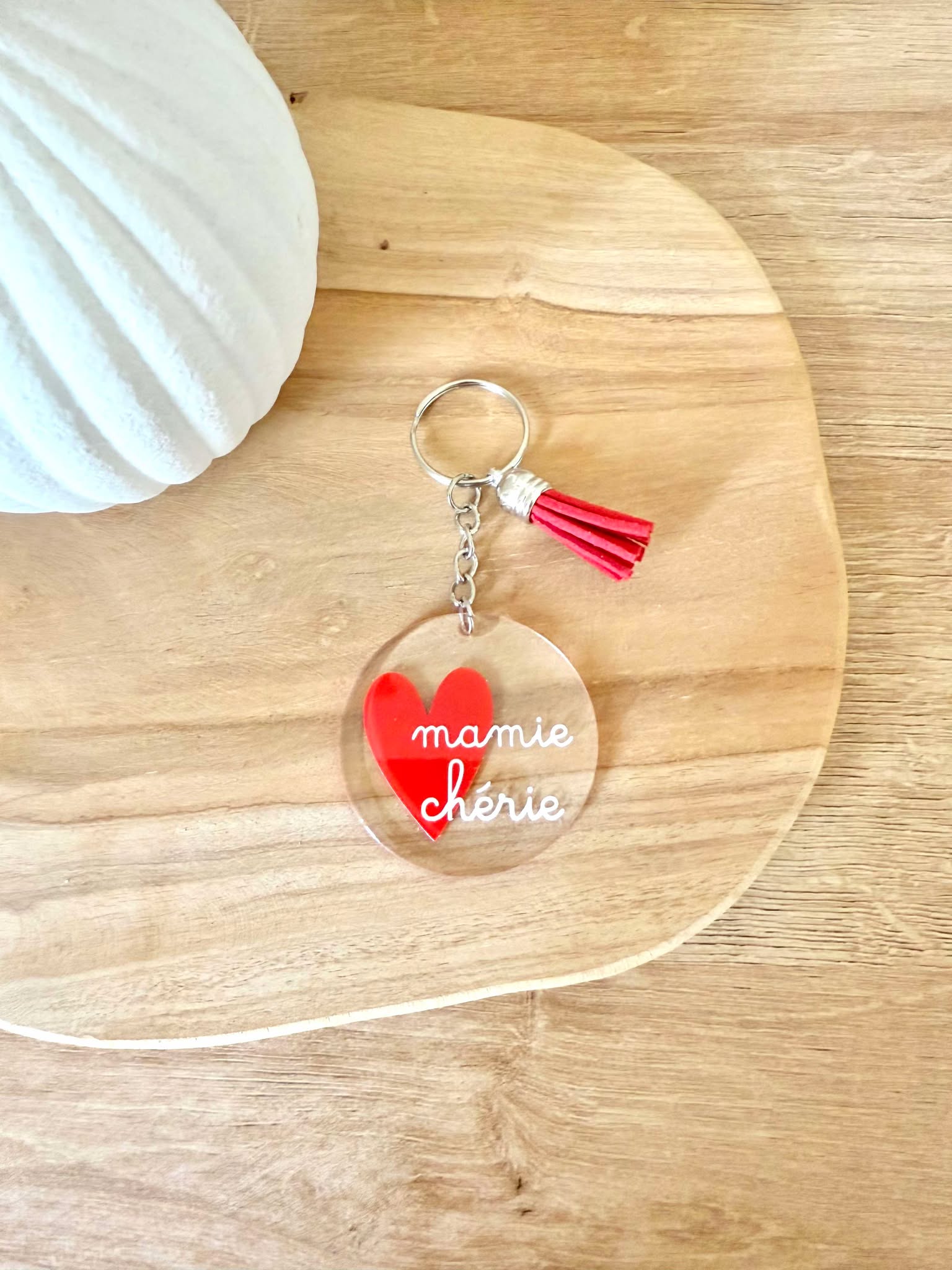 Joli porte clé en acrylique transparent pour les mamies. Le porte clé est protégé par de la résine UV.