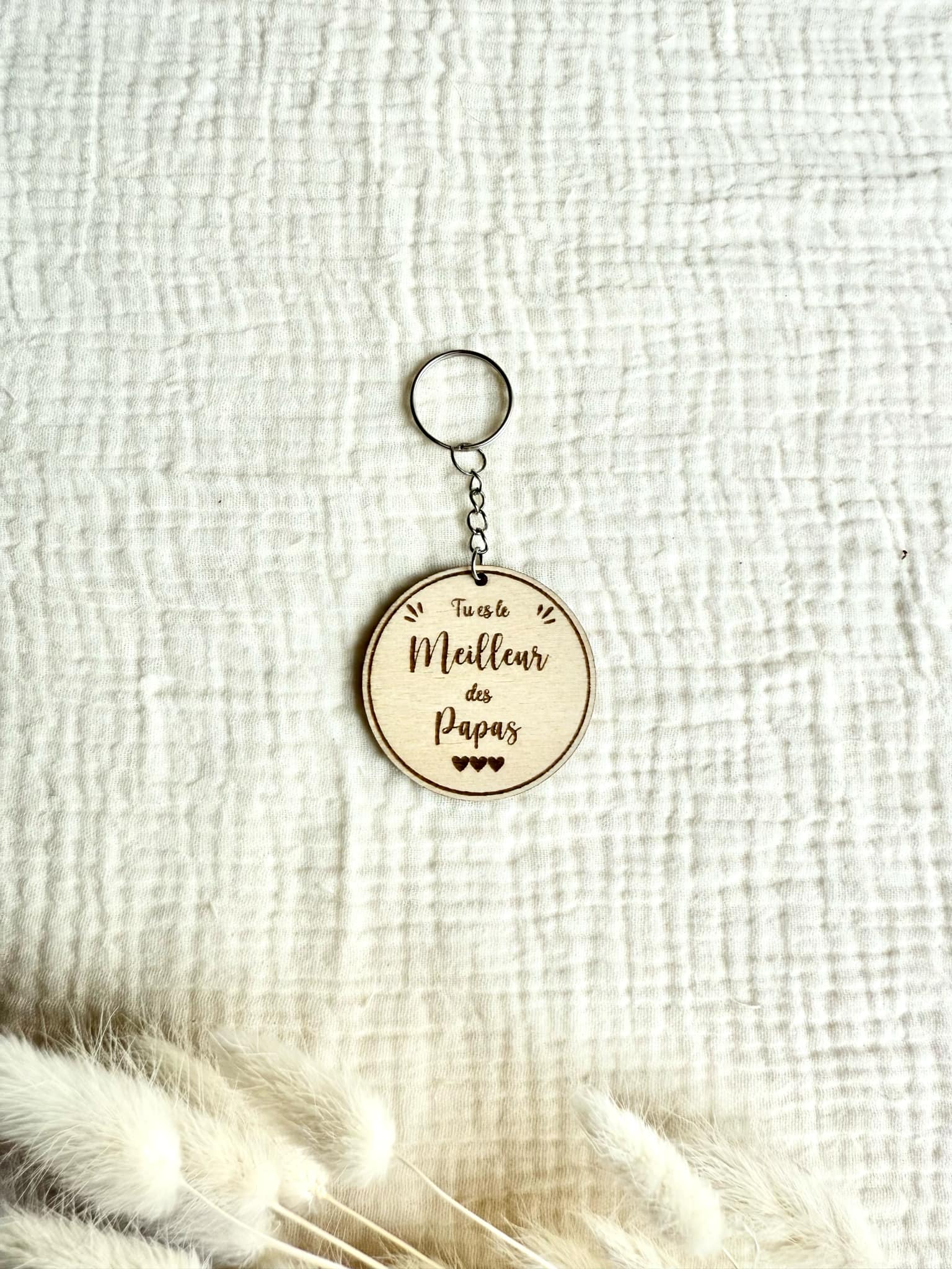 Joli porte clé en bois à offrir à votre papa ou celui de votre enfant. L'inscription sur le porte clé est gravé sur le bois.