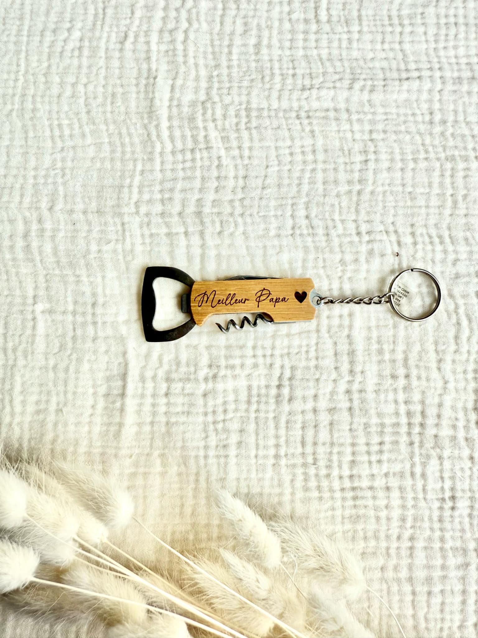 Joli porte clé en bambou à offrir à votre papa ou celui de votre enfant. L'inscription sur le porte clé est gravé sur le bois.