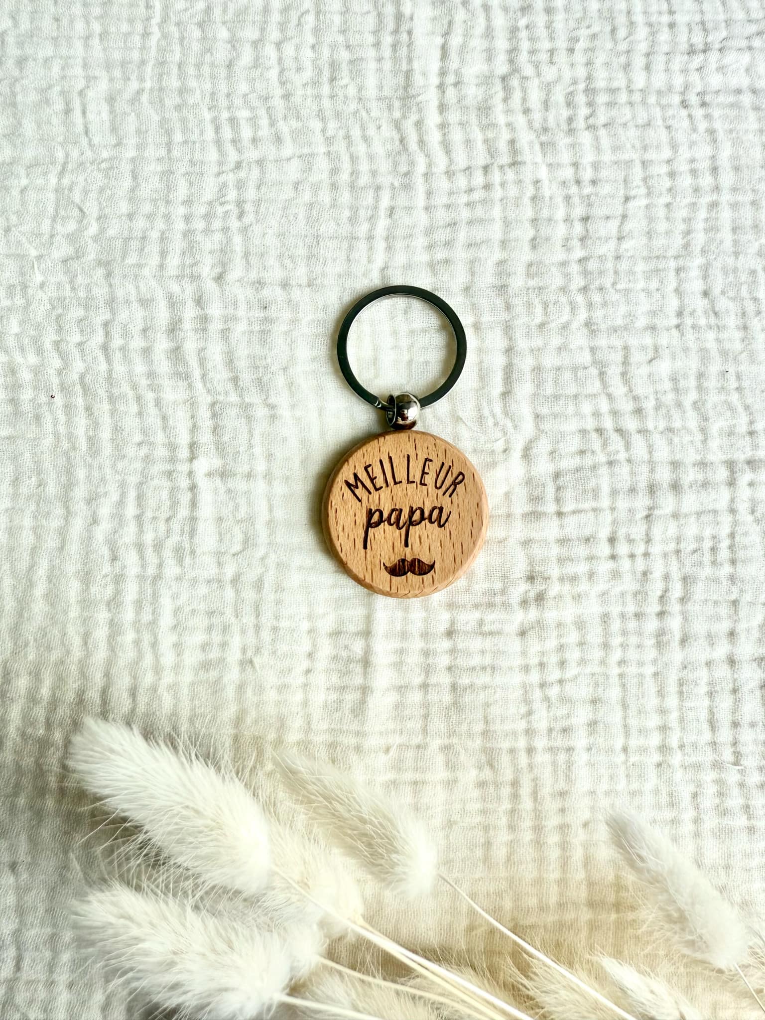 Joli porte clé en bois à offrir à votre papa ou celui de votre enfant. L'inscription sur le porte clé est gravé sur le bois, et gravé des deux côtés du porte clé.