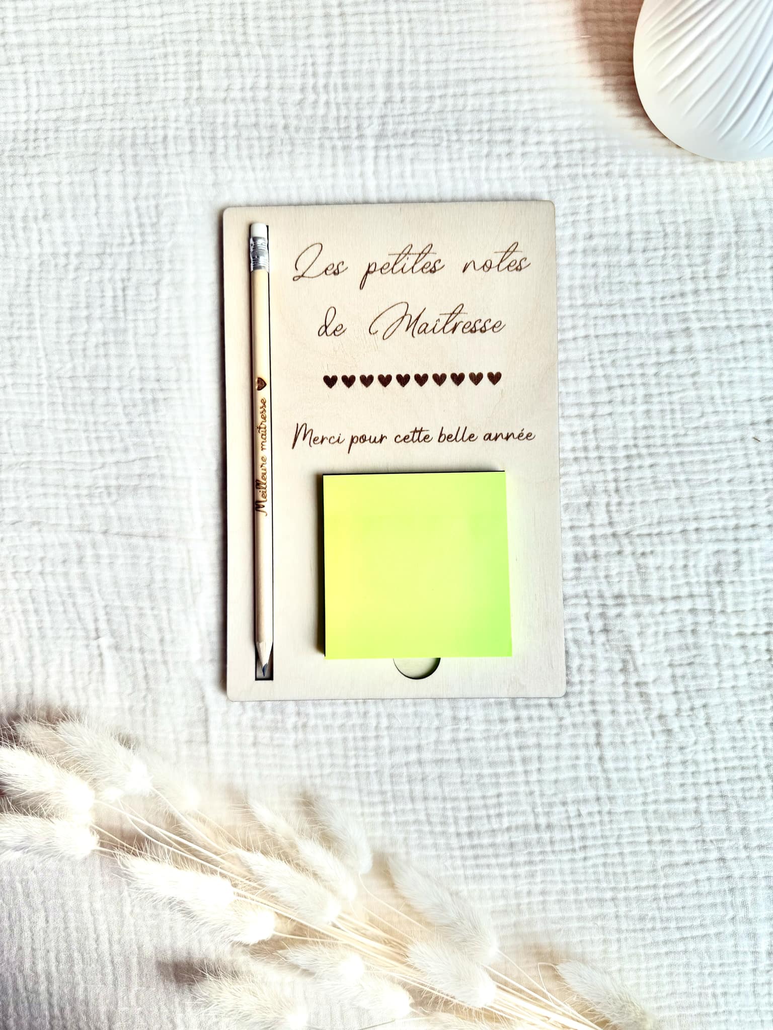 Voici un cadeau original qui sort de l'ordinaire. Un support à post-it accompagné de son crayon à papier. Vous avez la possibilité de changer le texte si vous le souhaitez. La couleur des post-it est aléatoire.