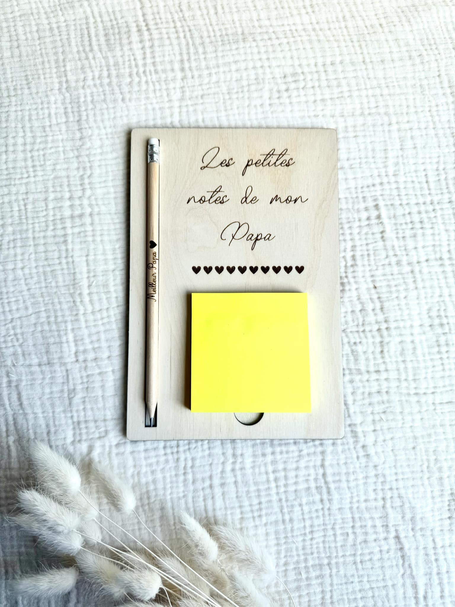 Voici un cadeau original qui sort de l'ordinaire. Un support à post-it accompagné de son crayon à papier. Vous avez la possibilité de changer le texte si vous le souhaitez. La couleur des post-it est aléatoire.